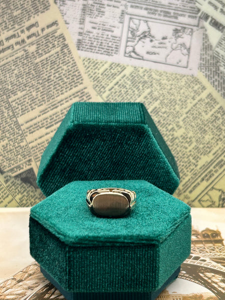 A beautifully crafted vintage piece in 10K yellow gold, this oval signet-style ring is adorned with intricate sculpted patterns that highlight its classic character. The polished oval face is perfect for personal engraving—add your initial or family crest to make it uniquely your own. This pre-owned ring is in fantastic condition and has been professionally cleaned.