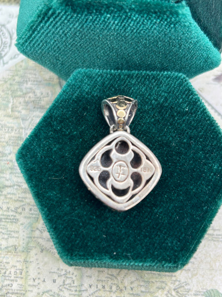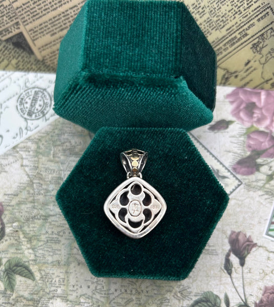 John Hardy pendant crafted in solid 925 sterling silver and 18k gold. Features signature hand-carved detailing inspired by traditional Balinese design. Classic, elegant, and beautifully made.